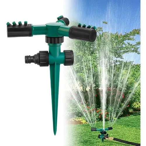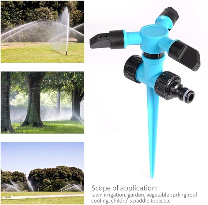 360 Degree Rotation Lawn Sprinkler with 3 adjustable rotating efficient irrigation Easy to assemble and just connect water joint to the connector and tap and the water will automatically drive the sprinkler to start watering the garden and lawn.